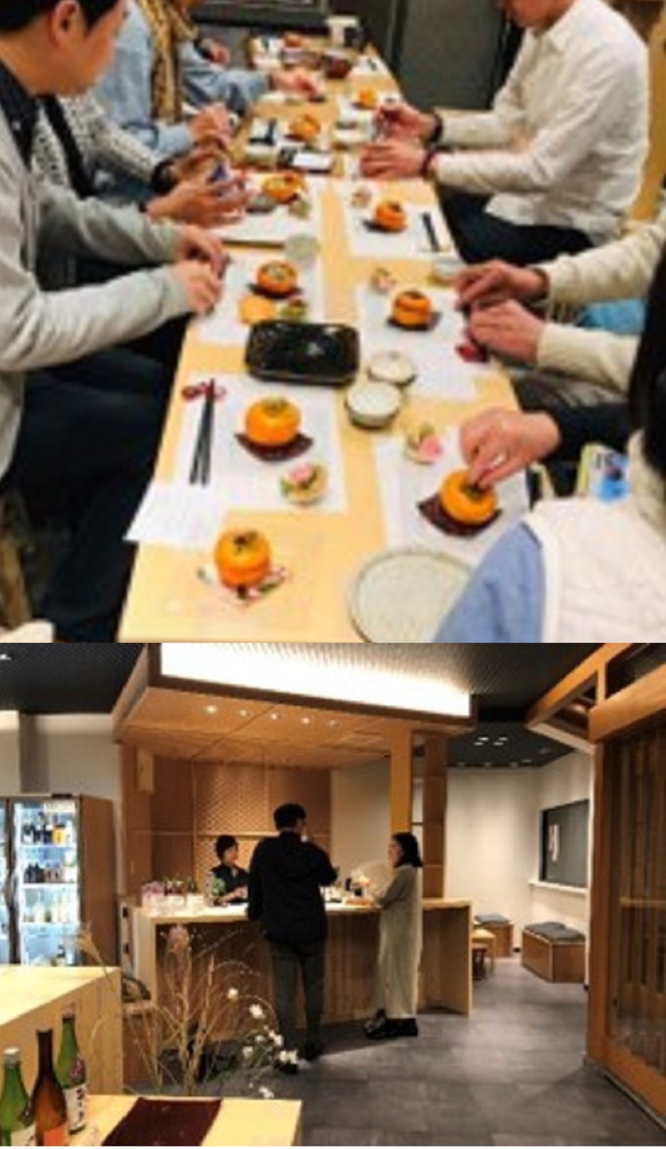 越前焼の窯元さんとコラボし自店で開催したお酒と器の会(上)、店内の試飲カウンター(下)