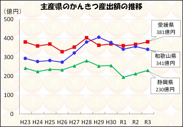 全国主産県のかんきつ産出額(売上額)の推移は、令和3年で愛媛県が1位、2位和歌山県、3位静岡県になっています。